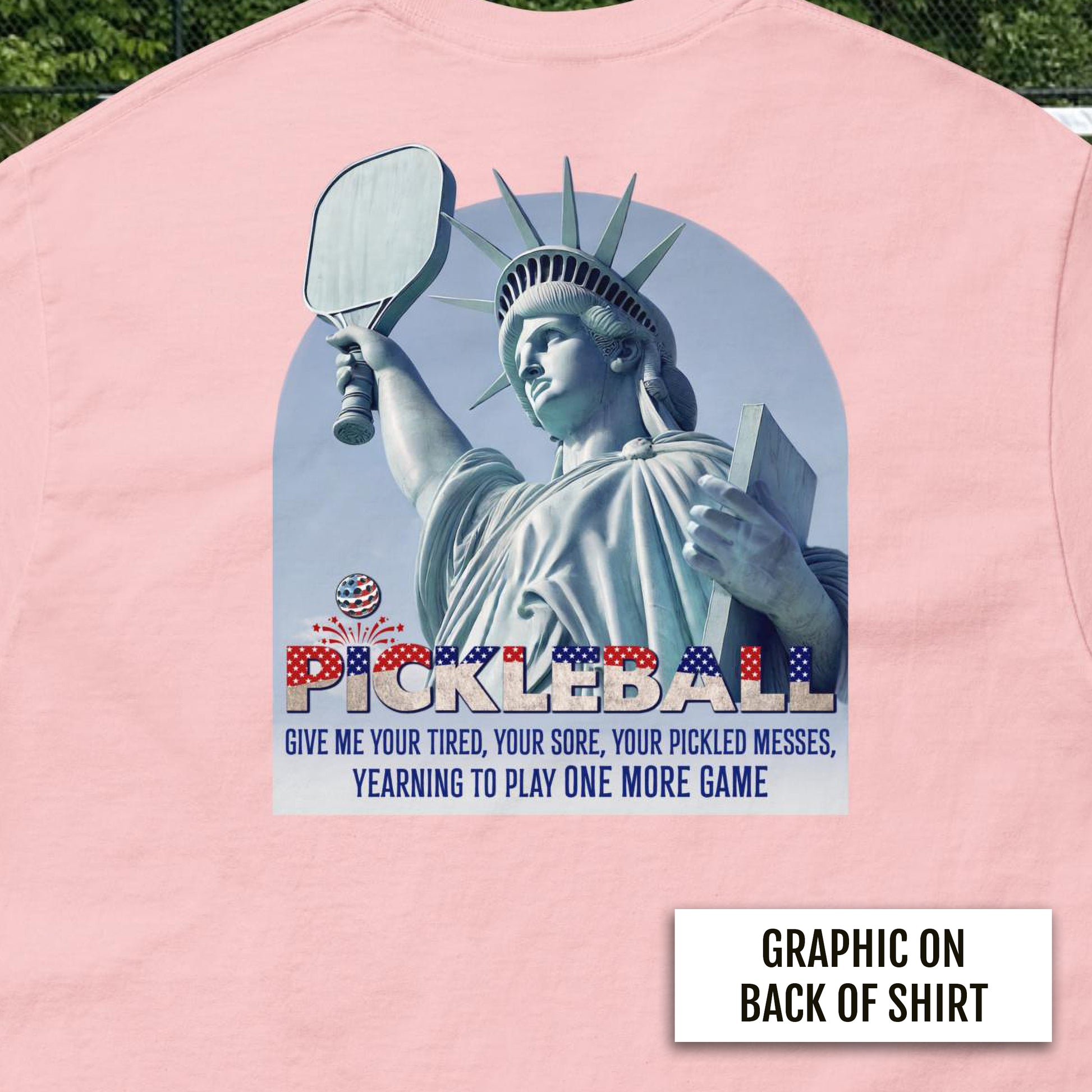 Look cool and stay cool in this fun and unique Statue of Liberty shirt while sharing laughs and scoring points on the court, or to show off your love for pickleball out around town. Or surprise your doubles partner and pickleball-loving family and friends with this fun birthday present, holiday gift or any day perfect pickleball gift.