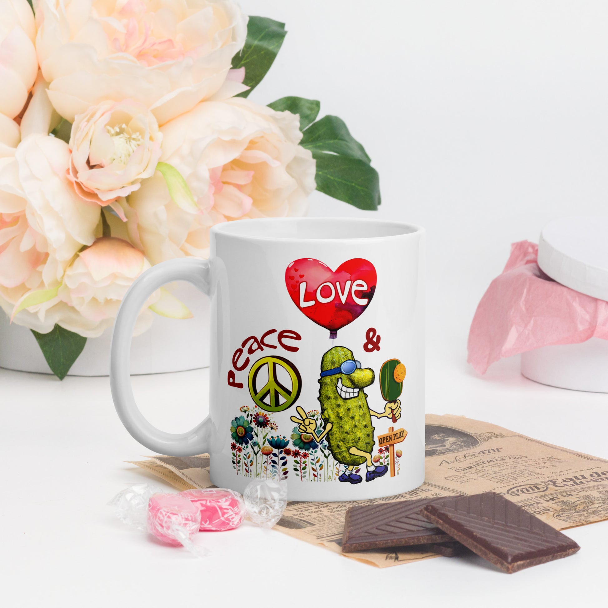 Fun Pickleball Mug, Peace, Love & Pickleball, White, 11oz or 15oz