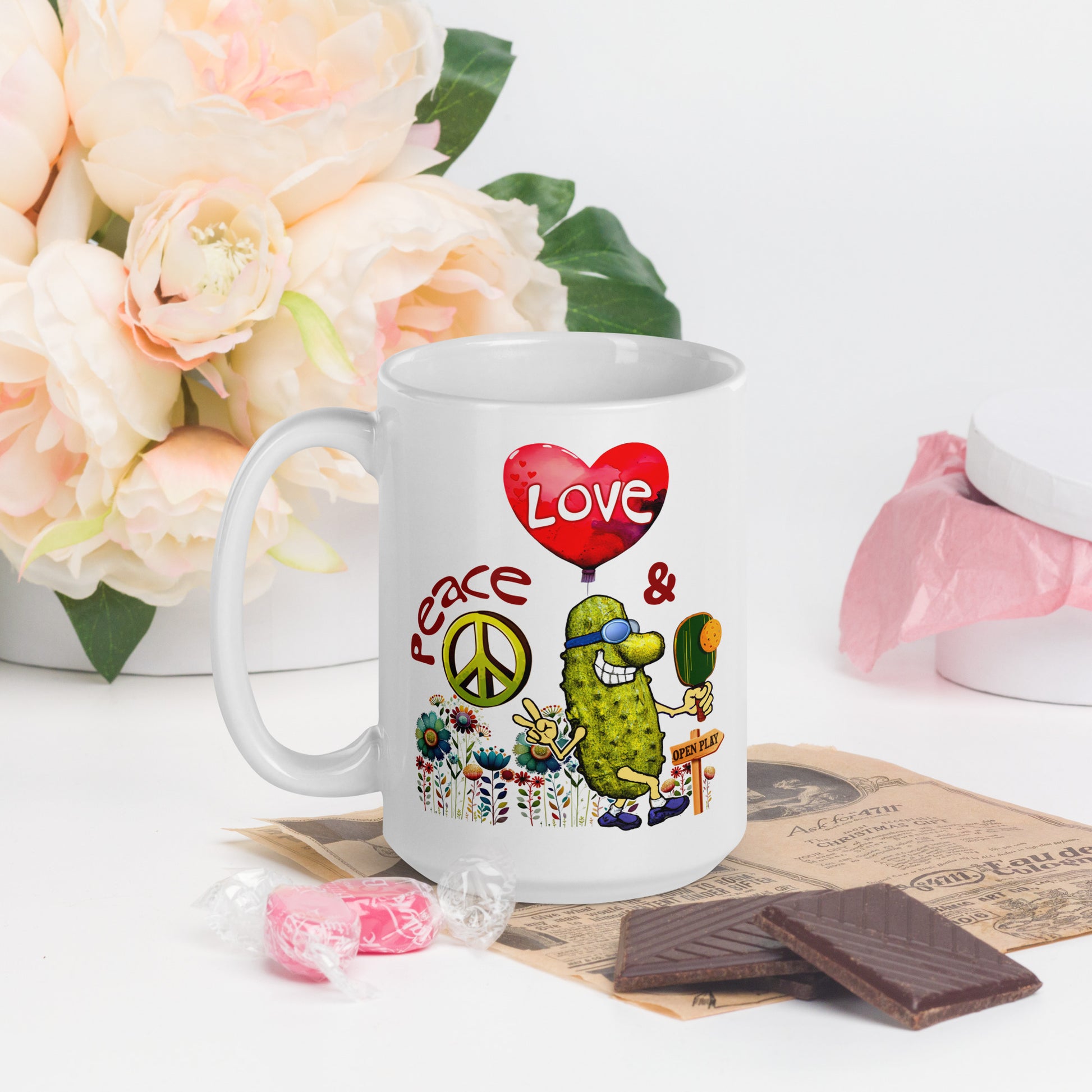 No matter what you want to fill it with, here's the PERFECT fun, funny and unique Peace, Love & Pickleball mug for you, or as a birthday present, holiday gift or any day surprise for your doubles partner or pickleball-loving family and friends. Whether for enjoying morning coffee, evening tea, to fill with candy treats for gifting or simply to show off anybody's love for pickleball — everybody will love this Peace, Love & Pickleball mug!