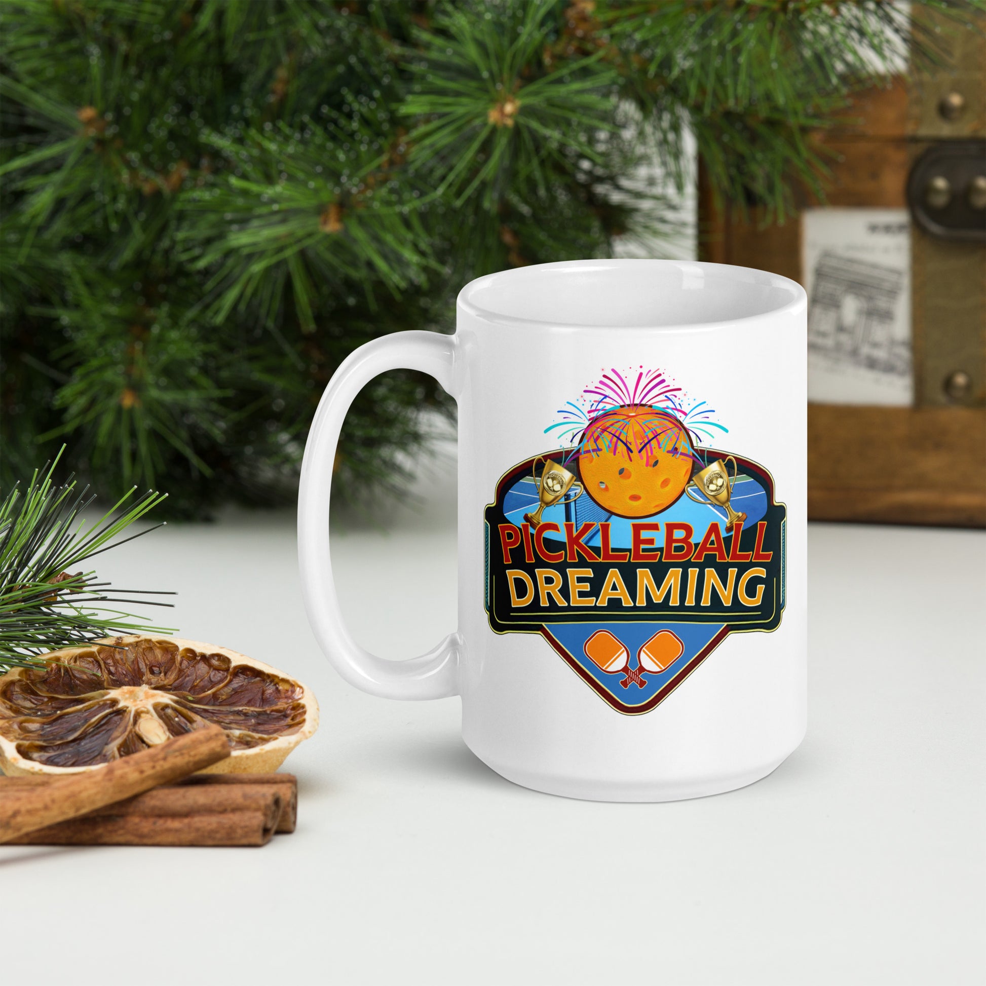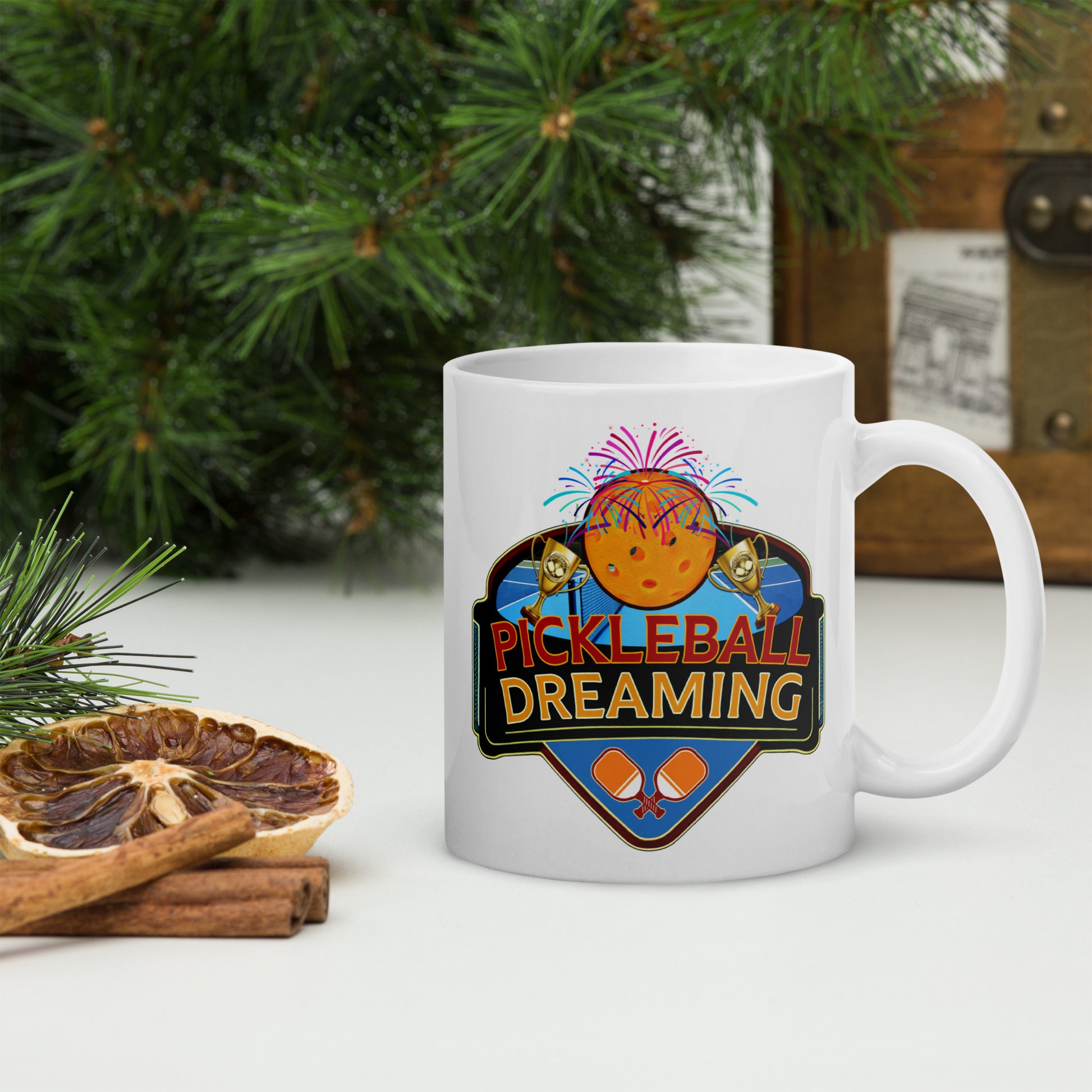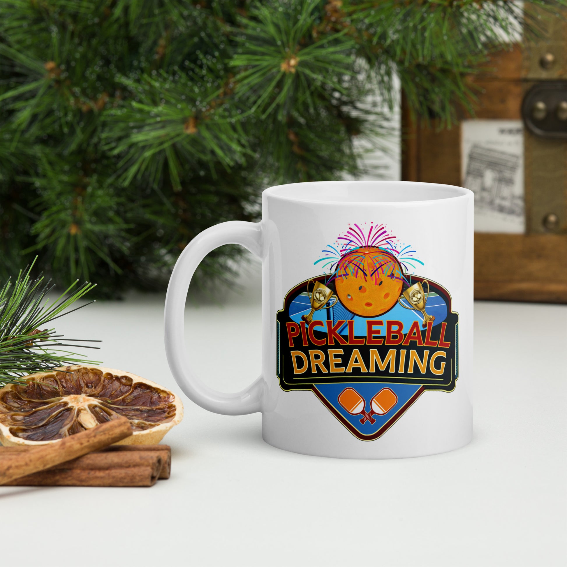 No matter what you want to fill it with, here's the PERFECT fun, funny and unique Pickleball Dreaming Fireworks pickleball mug for you, or as a birthday present, holiday gift or any day surprise for your doubles partner or pickleball-loving family and friends. Whether for enjoying morning coffee, evening tea, to fill with candy treats for gifting or simply to show off anybody's love for pickleball — everybody will love this Pickleball Dreaming mug!