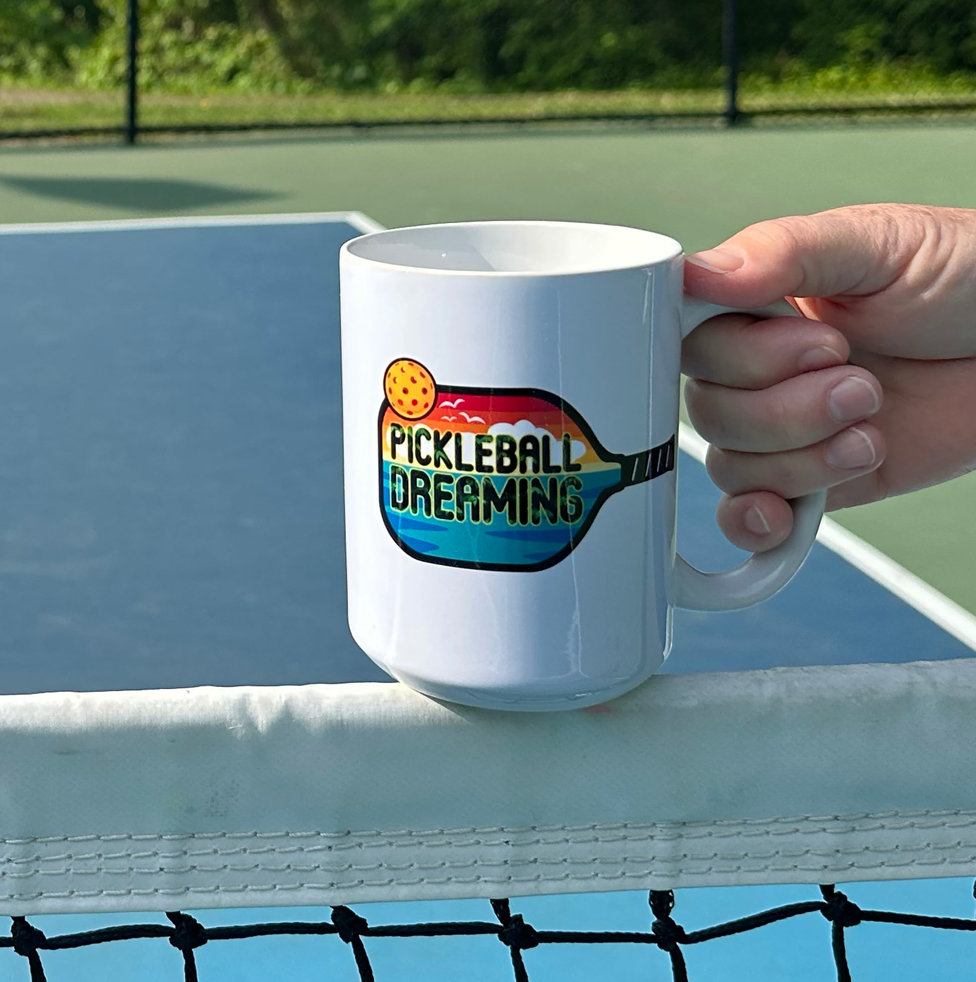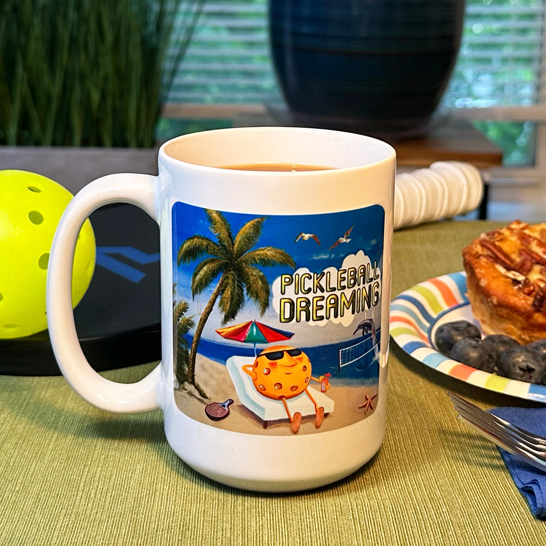 No matter what you want to fill it with, here's the PERFECT fun, funny and unique Pickleball Dreaming pickleball mug for you, or as a birthday present, holiday gift or any day surprise for your doubles partner or pickleball-loving family and friends. Whether for enjoying morning coffee, evening tea, to fill with candy treats for gifting or simply to show off anybody's love for pickleball — everybody will love this Pickleball Dreaming mug!