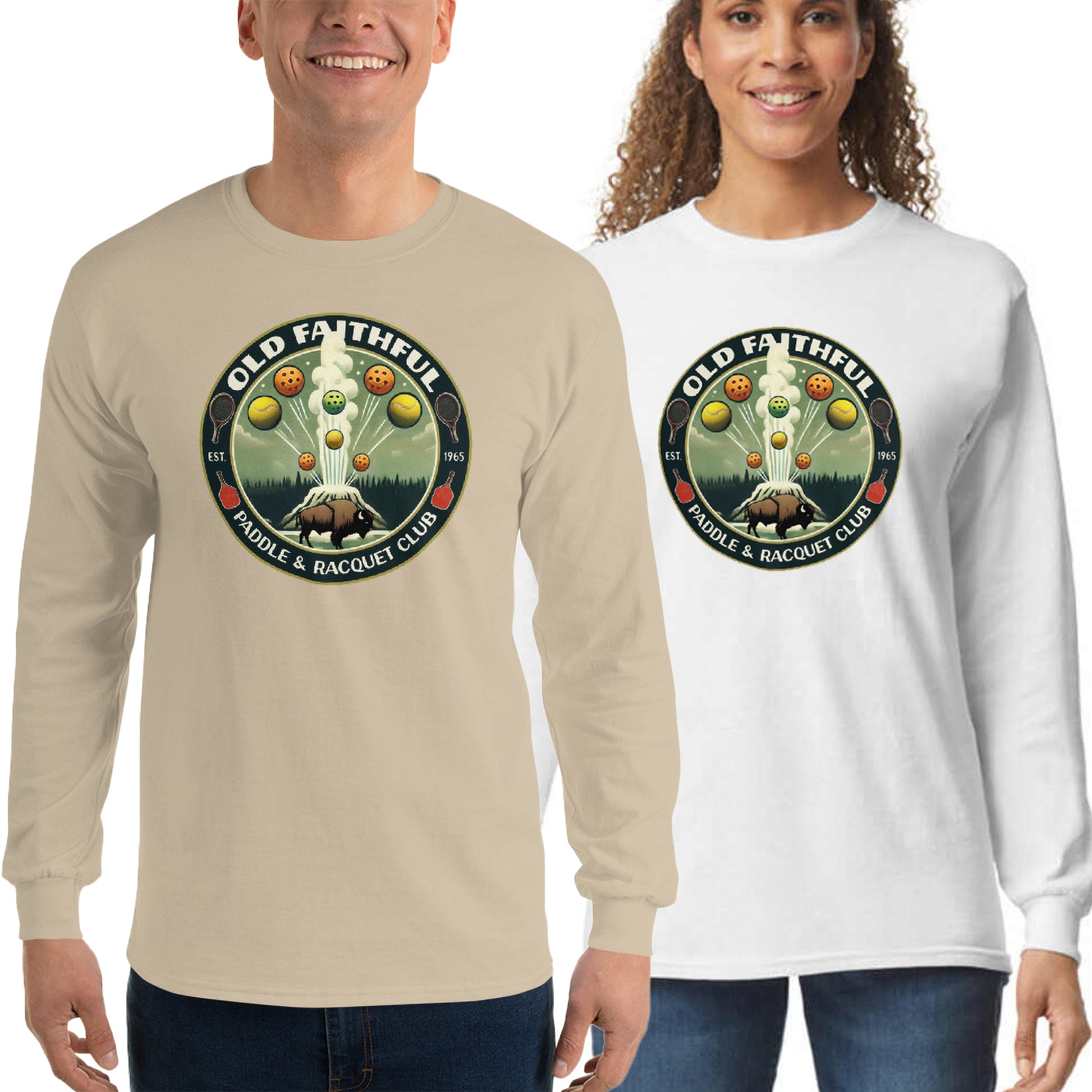 Fun Yellowstone Pickleball Shirt, Old Faithful Paddle & Racquet Club, Front Center Graphic, Long-sleeve
