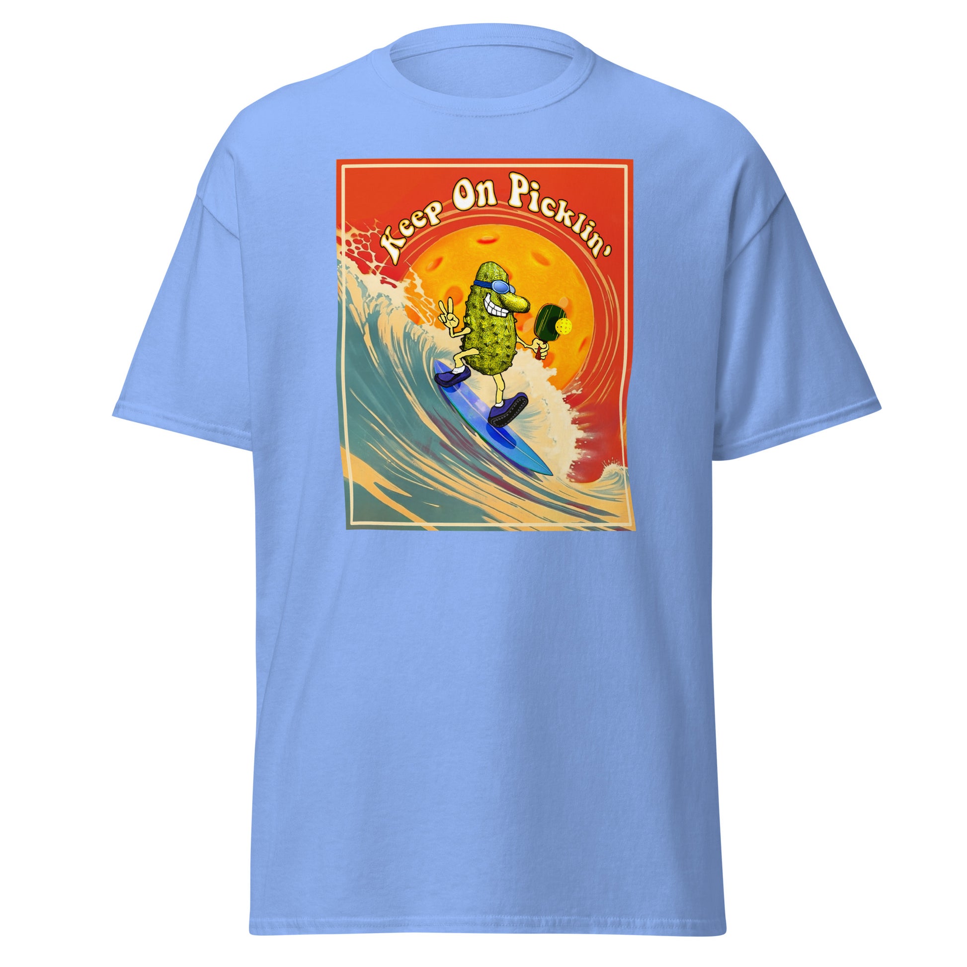Men's Pickleball T-shirt, Keep On Picklin' Surfer, Front Center Graphic, Short-sleeve