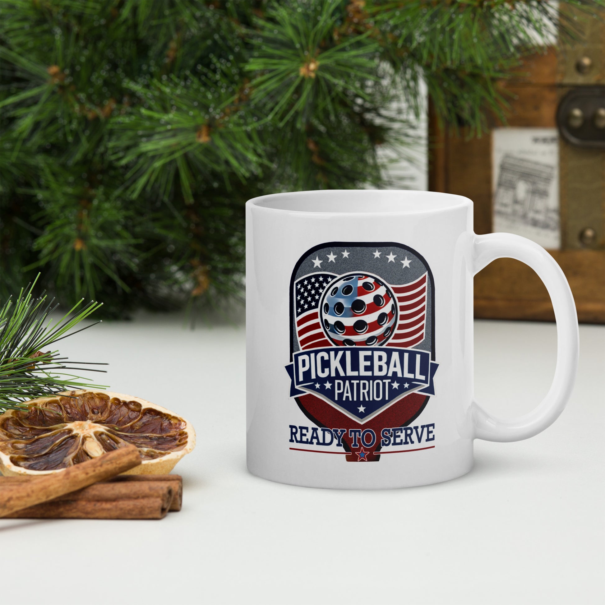 Patriotic Pickleball Mug, Pickleball Patriot Paddle Graphic, White, 11 oz or 15 oz